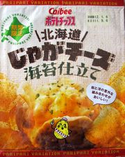 (右)北海道産のじゃがいもと北海道産のチーズを使用した芳醇で濃厚な味わい。さらにコクのあるおいしさを引き立てる海苔の風味。和と洋の意外な組み合わせがぴったりマッチしたポテトチップスです。
