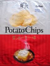 (左)風味豊かな北海道産バターに香ばしいしょうゆを効かせたポテトチップスです。濃厚さの中にさっぱりとした味わいのある、後引くおいしさです。