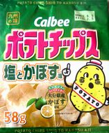(塩とかぼす)大分県名産のかぼすを使用 かぼすの爽やかな香りとすっきりとした酸味が効いた、さっぱり後引くおいしさのポテトチップスです。シンプルな塩味とマッチした、食べやすくてくせになる味わいをお楽しみください。