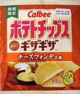 (こんがりチーズ) ポテトチップスギザギザのこんがりチーズ味は、北海道産チーズをほどよく焼いた、濃厚で香ばしい味わい。じゃがいもと、コクのあるチーズが絶妙にマッチしたおいしさです。