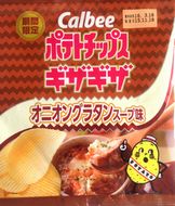 (右)オニオンの旨みと甘みが効いたスープに、バケットを浮かべチーズをかけて焼き上げた「オニオングラタンスープ」のおいしさをポテトチップスにしました。まろやかでほっとする味わいをお楽しみください。